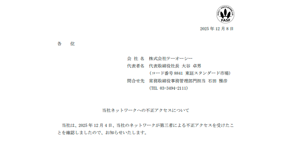 海外子会社利用のシステムが不正アクセス被害│FCLコンポーネント株式会社 画像:FCLコンポーネント株式会社より引用 FCLコンポーネント株式会社は2025年12月3日、海外子会社が利... 2025.12.17
