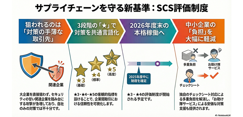 こうした背景から、経済産業省は2025年12月に「サプライチェーン強化に向けたセキュリティ対策評価制度(SCS評価制度)」の構築方針案を公表しました。