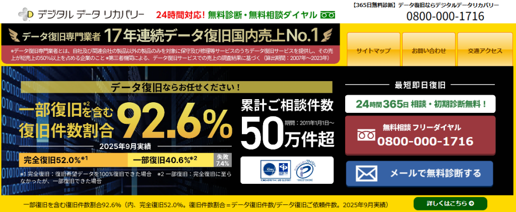 | 特長 | ✔データ復旧専門業者 17年連続データ復旧国内売上No.1(※1) ✔一部復旧を含む復旧件数割合92.6%(※2)の非常に高い技術力 ✔官公庁や大手企業を含む累積50万件以上の相談実績 ✔相談・初期診断無料(デジタルデータリカバリーへの配送料も無料) ✔365日年中無休で復旧対応 |