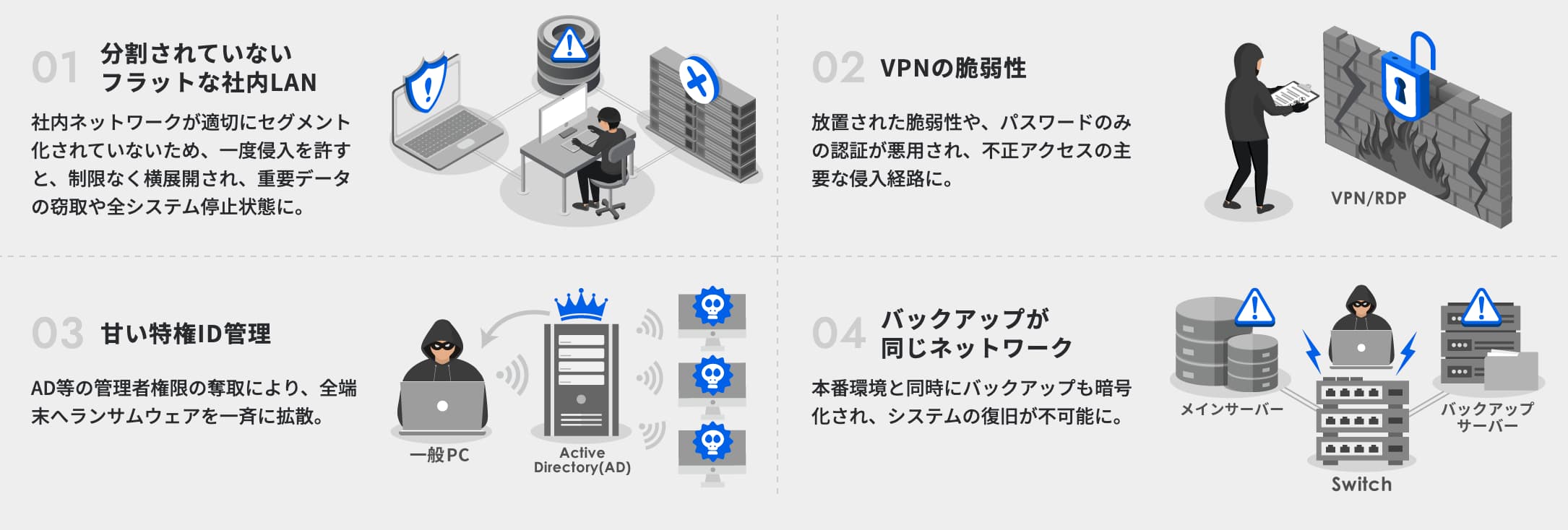 部署ごとに分離されていない社内LAN、穴のあるVPNやリモート接続、甘い特権ID管理、同じネットワーク上に置かれたバックアップ——。