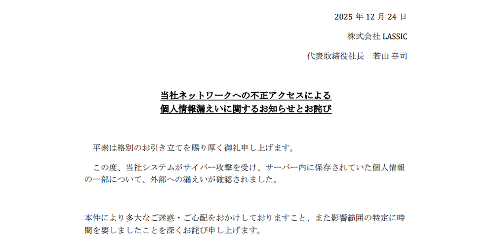 画像:株式会社LASSICより引用 人材関連会社の株式会社LASSICは2025年12月24日、同社のネットワークがサイバー攻撃を...