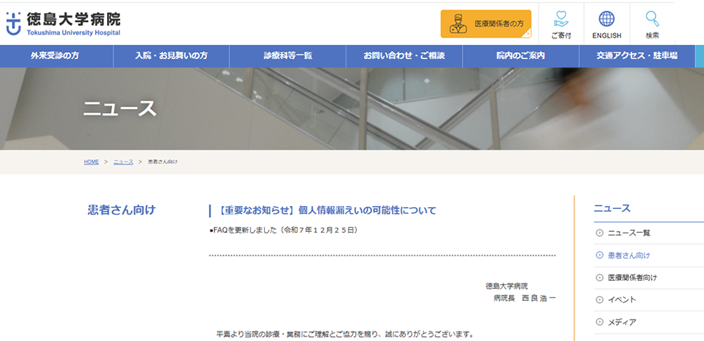 不正アクセスの影響で最大約1万8千名分の個人情報の漏えい可能性│徳島大学病院