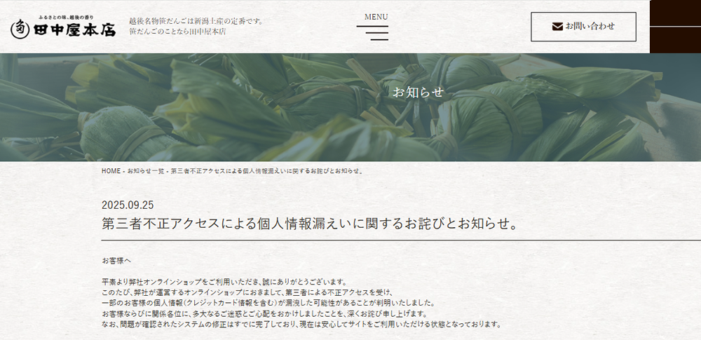 和菓子店「田中屋本店」を運営する株式会社田中屋本店は2025年9月25日、運営するオンラインショップにおいて第三者からの不正アクセスが発生し、一部の顧客情報が流出した可能性があると発表しました。