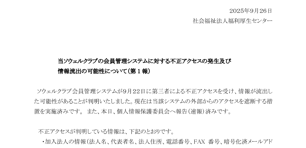社会福祉法人福利厚生センターは2025年9月26日、センターが運営する「ソウェルクラブ」の会員管理システムに不正アクセスが発生し、情報流出の可能性が判明したと発表しました。