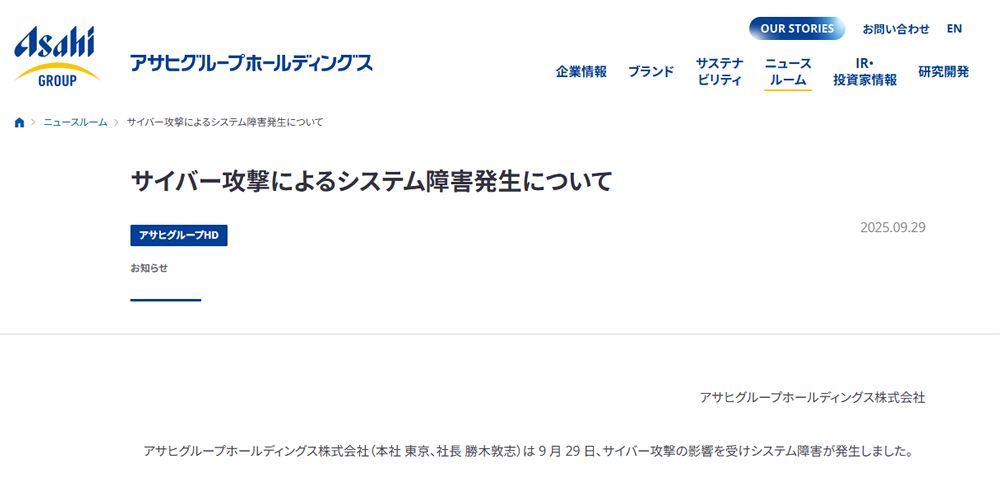 アサヒグループホールディングスは2025年9月29日、サイバー攻撃の影響でシステム障害が発生したと発表しました。