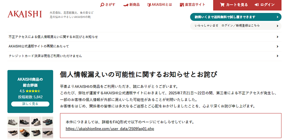 株式会社AKAISHIはこのほど、自社が運営する公式通販サイトにおいて不正アクセスが発生し、一部の顧客情報が外部に漏えいした可能性があると発表しました。