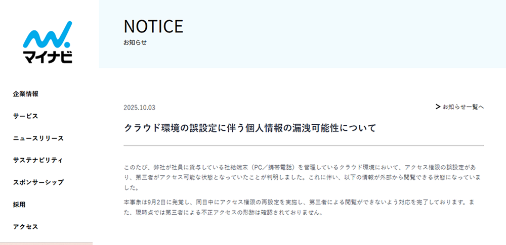 株式会社マイナビは2025年10月3日、従業員に貸与しているPCや携帯電話の管理に使用していたクラウド環境において、アクセス権限の誤設定があり、従業員や退職者の情報1万4,762件について、第三者がアクセスできる状態になっていたと発表しました。
