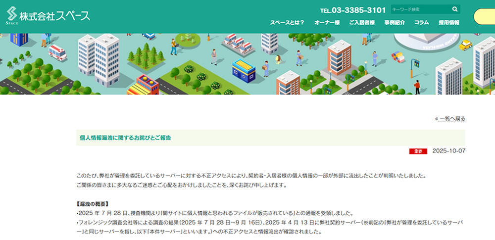 株式会社スペースは2025年10月7日、管理を委託しているサーバーが第三者の不正アクセスを受け、保有する個人情報の漏えい懸念を発表しました。