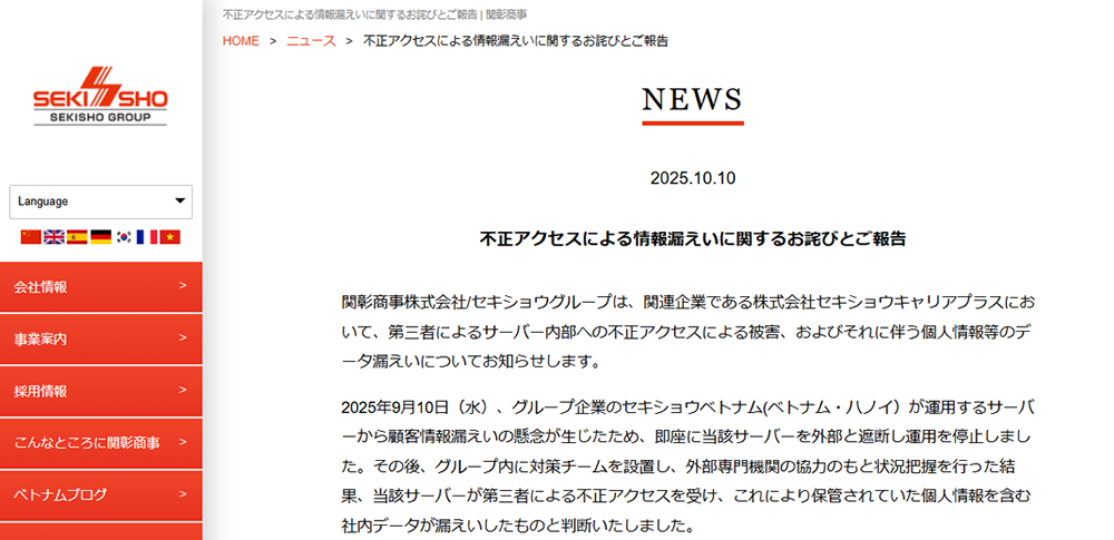 関彰商事株式会社(セキショウグループ)は2025年10月10日、海外グループ会社であるセキショウベトナムのサーバーに対する第三者の不正アクセスに伴い、セキショウベトナムの保有する個人情報最大1万5,535名および関連企業である株式会社セキショウキャリアプラスの日本人個人情報を含むデータが漏えいしたことを発表しました。