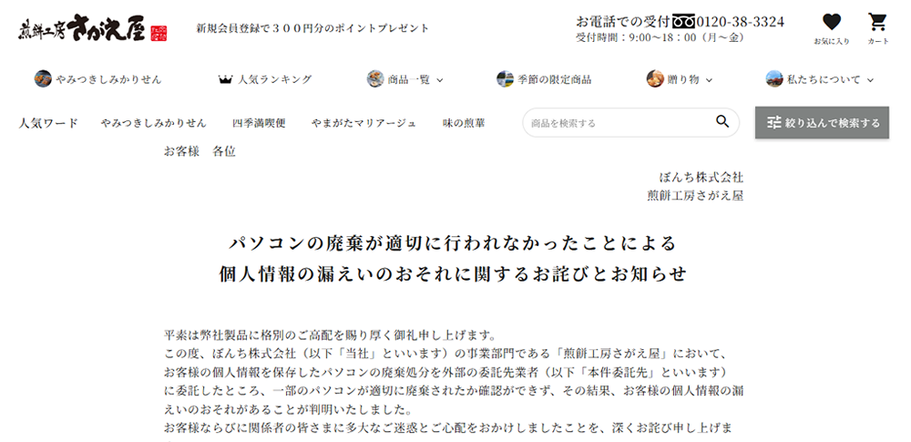ぼんち株式会社の事業部門「煎餅工房さがえ屋」は2025年10月、廃棄処分を委託したパソコンの一部が適切に処理されたか確認できず、顧客の個人情報が漏えいしたおそれがあることを明らかにしました。