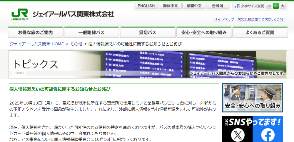 ジェイアールバス関東株式会社は2025年10月17日、同社の事業所の業務用パソコンが不正アクセスを受けたと発表しました。