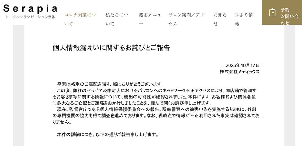 株式会社メディックスは2025年10月17日、同社が運営する整体サービス「セラピア淡路町店」にてパソコンに対する外部からの不正アクセスがあり、顧客情報1万5,210件について漏えいの可能性を発表しました。
