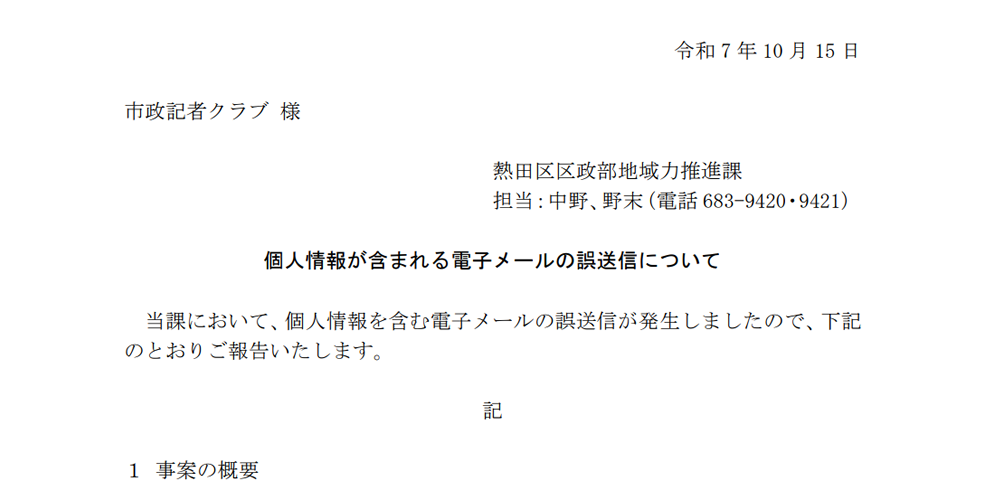 同課によると2025年10月2日、実施事業の参加者10組にメールを送信した際、宛名の氏名を誤って他の参加者の氏名と入れ替えて5件を送信しました。その後、誤送信に気付いた担当者が訂正と謝罪のメールを送ったが、この際に1組の宛先に他の参加者のメールアドレスを本文中に記載したまま再送信していた、とのこと。2025年10月6日に参加者からの返信により誤送信が発覚し、同課は関係者全員に謝罪しました。