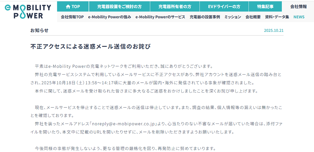 電気自動車向け充電ネットワークを運営する株式会社e-Mobility Powerは2025年10月21日、同社が利用しているメールサービスが不正アクセスを受け、大量の迷惑メールが送信されたと発表しました。