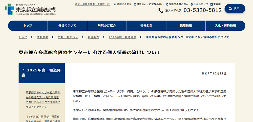 地方独立行政法人東京都立病院機構は2025年10月22日、正体不明の文書が機構や都民に届き、東京都立多摩総合医療センターの患者188名の個人情報が漏えいしていた、と発表しました。