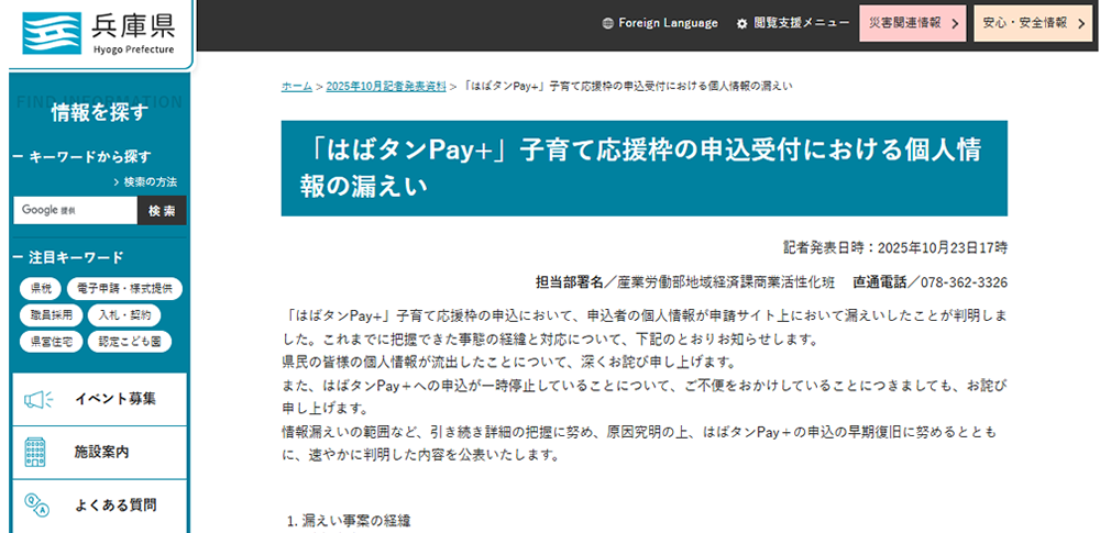 兵庫県は2025年10月24日までに、電子商品券「はばタンPay+」の子育て応援枠の申込受付において、申請者の個人情報が外部に漏えいした可能性があると発表しました。