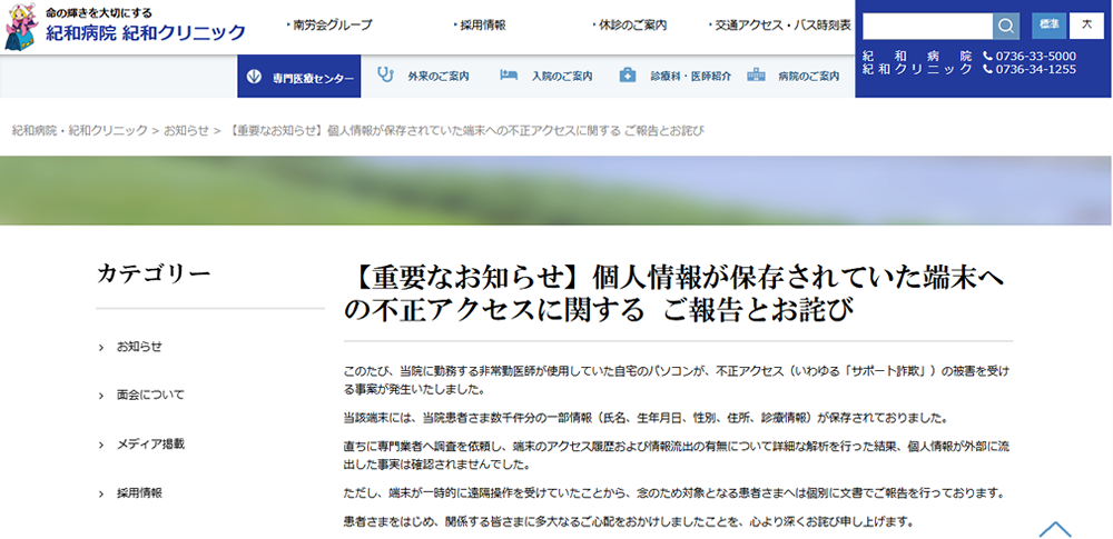 参照【重要なお知らせ】個人情報が保存されていた端末への不正アクセスに関する ご報告とお詫び|紀和病院