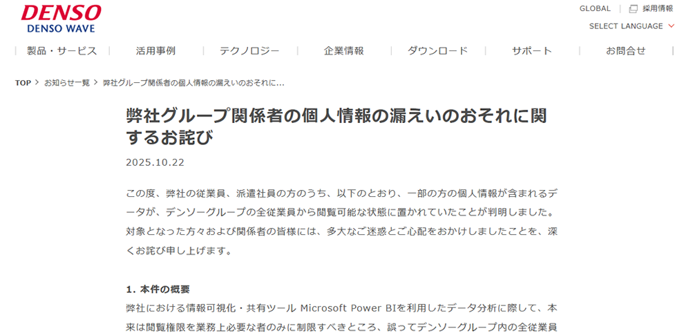 株式会社デンソーウェーブは2025年10月22日、システムの権限設定の誤りにより、同社グループの従業員や派遣社員の一部に関する個人情報を、デンソーグループ全従業員が閲覧可能な状態にあったことを明らかにしました。