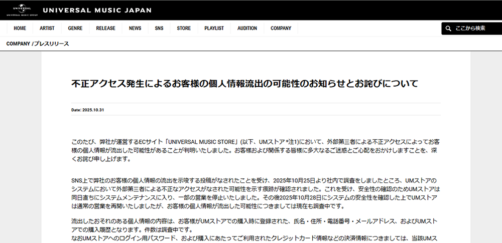 ユニバーサル ミュージック合同会社は2025年10月31日、同社が運営するECサイト「UNIVERSAL MUSIC STORE」(UMストア)において、不正アクセスにより顧客情報が流出した可能性が判明したと発表しました。