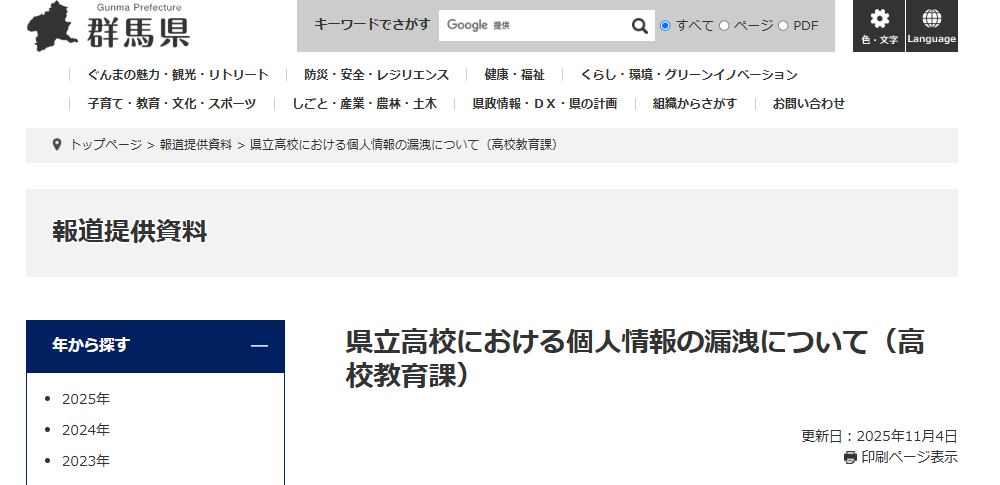 群馬県教育委員会は2025年11月4日、県立勢多農林高校において電子メールの誤送信があり、生徒の個人情報を含むファイルが誤って生徒全員に閲覧可能な状態で送信されていたことを明らかにしました。