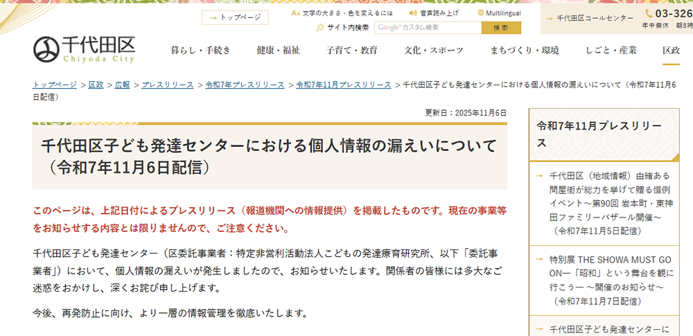 千代田区は2025年11月6日、区が委託する千代田区子ども発達センターにて個人情報の誤提供があり、本来公開すべきでない150件の個人情報を漏えいしたと明らかにしました。