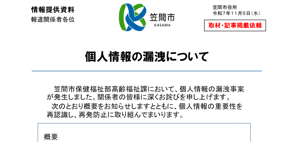 笠間市(茨城)は2025年11月5日、市の保健福祉部高齢福祉課が発信した電子メールに誤送信があり、介護サービス事業所に所属する従業員12名の個人情報を漏えいしたと発表しました。