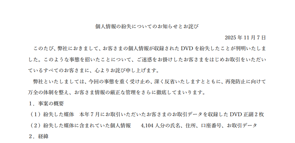 同社によると2025年10月14日、本社ビルで宅配業者から受領したDVDが、所定の保管場所に収納されていないことが従業員の確認により判明しました。DVDは2025年7月に取引があった顧客4,104人分の氏名、住所、口座番号、取引データが記録された正・副2枚で、同社は社内調査を進めましたが発見には至りませんでした。郵送物はすでに廃棄され、DVDも誤って廃棄された可能性があるとの見方です。