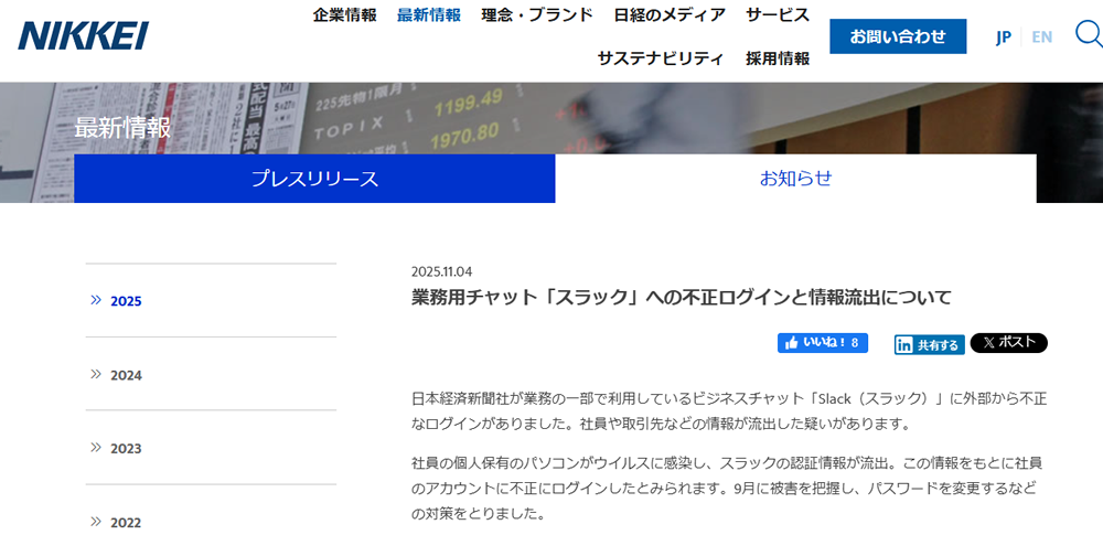 株式会社日本経済新聞社は2025年11月4日、業務の一部で利用しているビジネスチャット「Slack(スラック)」に対する外部から不正アクセスが発生し、社員や取引先など1万7368人分の個人情報および対話履歴が流出した可能性があると発表しました。