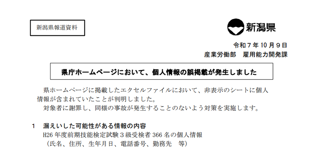 新潟県は2025年10月9日、県庁ホームページに掲載していたエクセルファイルについて、本来公開すべきでない平成26年度前期技能検定3級受検者366名の個人情報が掲載されていた、と発表しました。