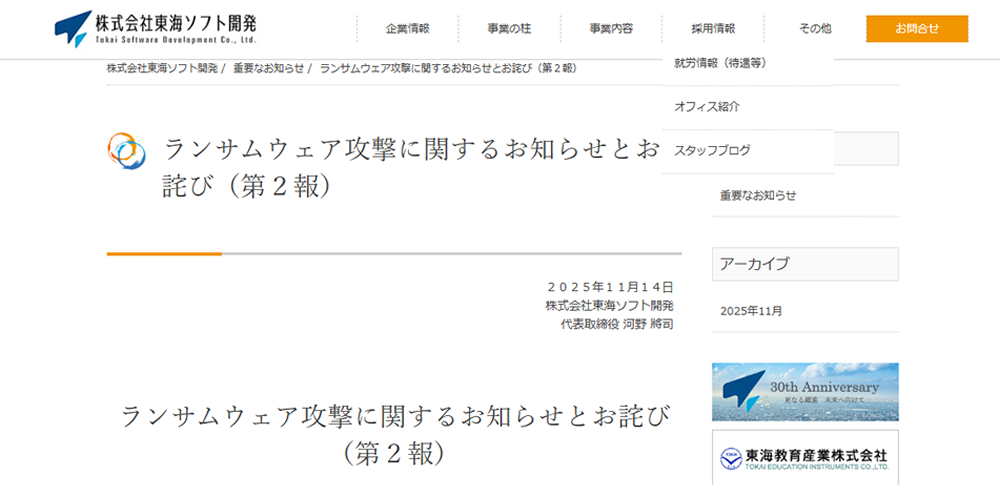 同社によると、攻撃は2025年11月7日に確認されました。2025年11月13日の発表当初、同社は「外部へのデータ流出などは見受けられません(可能性は否定できない)」と説明していましたが、翌日2025年11月14日、管理していた情報について漏洩の可能性が「大きく疑われる」と続報の発表をしました。