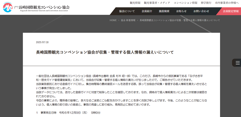 一般社団法人長崎国際観光コンベンション協会は2025年11月13日、長崎市から受託している「ながさき平和・歴史ガイド管理運営業務」において電子メールの誤送信があり、同協会が管理する情報が漏えいしたと発表しました。