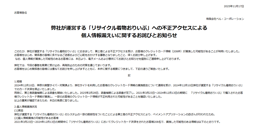 有限会社ベル・コーポレーションは2025年11月17日、同社が運営するオンラインショップ「リサイクル着物おりいぶ」において不正アクセスが発生し、利用客のクレジットカード情報208件が漏えいした可能性があると発表しました。