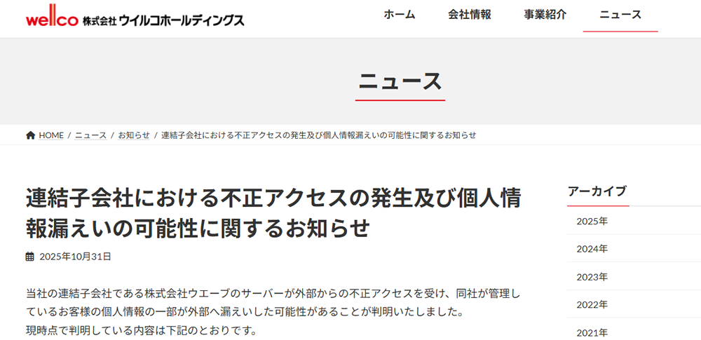株式会社ウイルコホールディングスは2025年10月31日、連結子会社の株式会社ウエーブのサーバーが外部から不正アクセスを受け、同社が管理する顧客情報の一部が外部へ流出した可能性が判明したと発表しました。