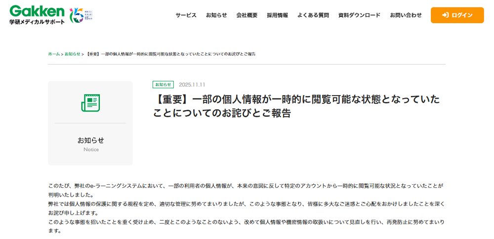 看護学校向けサービスなどを展開する株式会社学研メディカルサポートは2025年11月11日、同社が提供するeラーニングシステムにおいて、設定不備により利用者の個人情報が一時的に他の特定のアカウントから閲覧可能になっていたと発表しました。