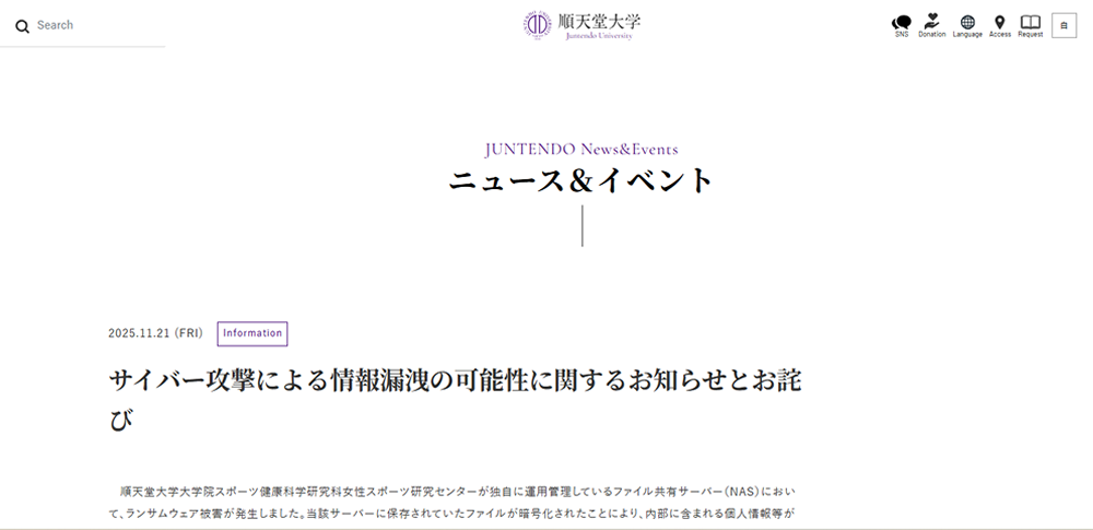 順天堂大学は2025年11月、同大大学院スポーツ健康科学研究科の女性スポーツ研究センターが独自に運用していたファイル共有サーバーがランサムウェアの被害を受けたと発表しました。