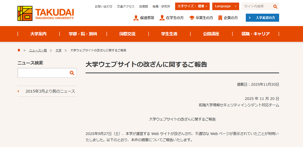 拓殖大学は2025年11月20日、同大学が運営するウェブサイトの一部が不正に改ざんされたと発表しました