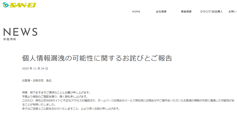 株式会社三英は2025年11月24日、公式Webサイトに対する不正アクセスがあり、顧客および取引先の個人情報が漏洩した可能性があると発表しました。