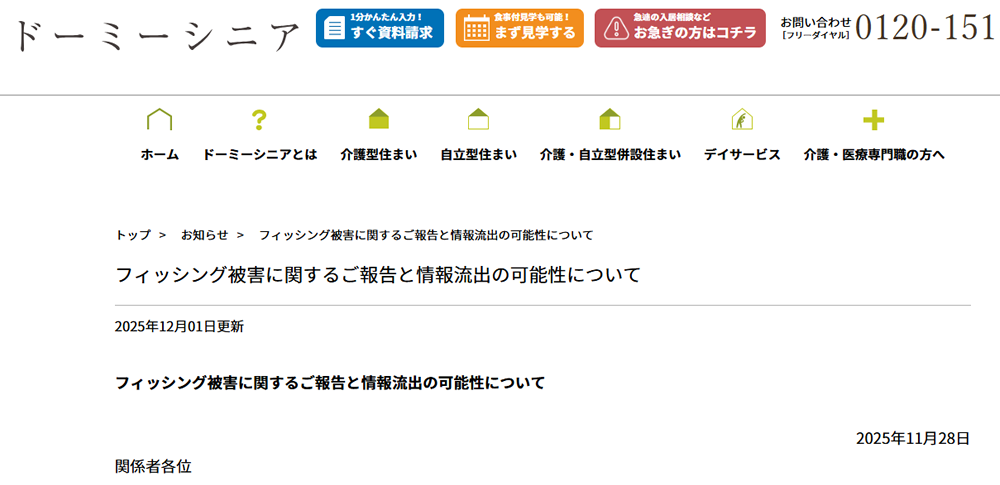 介護付有料老人ホーム「ドーミーシニア」などを運営する株式会社共立メンテナンスは2025年11月28日、従業員が受信したフィッシングメールを起点とする不正操作により、顧客などの個人情報が外部に流出した可能性があると発表しました。