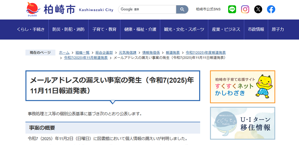 柏崎市は2025年11月11日、市の図書館職員によるメール誤送信があり、登録ボランティアの個人情報が漏えいしたと発表しました。