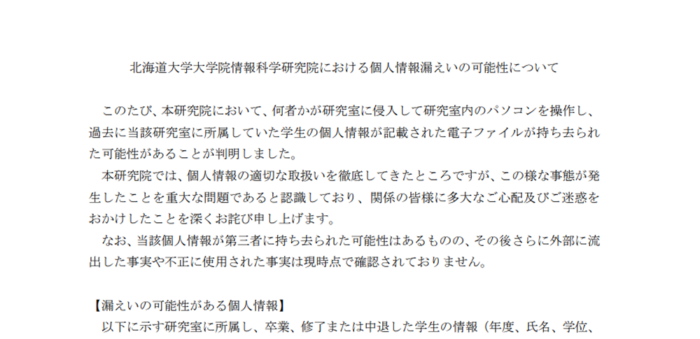 北海道大学大学院 情報科学研究院は2025年12月2日、何者かが同大学院の研究室に侵入した外部の人間にパソコンが操作され、過去に研究室へ所属していた学生の個人情報が持ち去られた可能性があると発表しました。