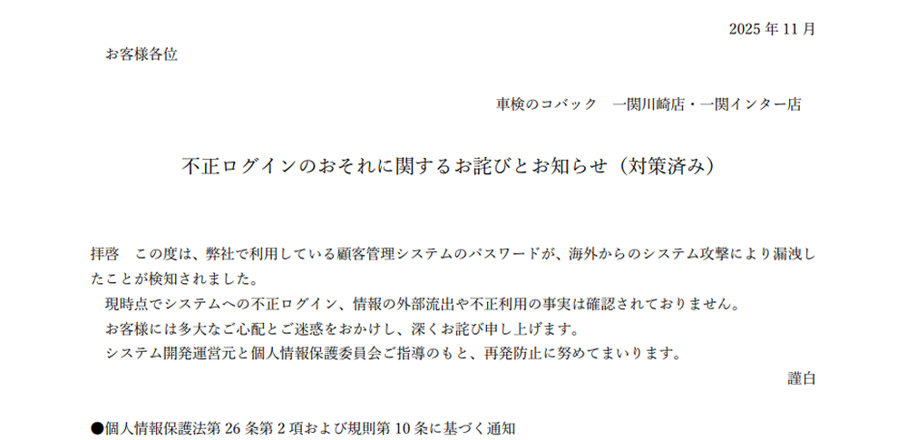 車検のコバック 一関川崎店・一関インター店は2025年11月、同店が利用している顧客管理システムに対する不正ログインの懸念を発表しました。