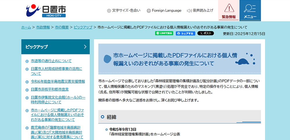 日置市(鹿児島)は2025年12月15日、日置市のホームページに掲載していたPDFファイルの一部において、個人情報が閲覧可能な状態で公開されていたことが判明したと発表しました。