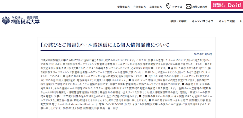 桐蔭横浜大学は2025年11月26日、同大学から送信したメールの誤送信により、参加者のメールアドレスが第三者に閲覧可能な状態となる個人情報漏えい事案が発生したと発表しました。