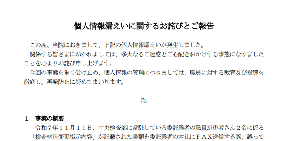 同院によると2025年11月11日、中央検査部に常駐する委託事業者の職員が、患者2名に関する「検査材料変更指示内容」が記載された書類を委託業者本社へのFAX送信を試みました。ところが、送信時に誤りがあり、本来送信すべき本社ではなく、個人宅へ送信していたことが判明しました。送信後、受信した個人宅より誤りの連絡があり、発覚しました。