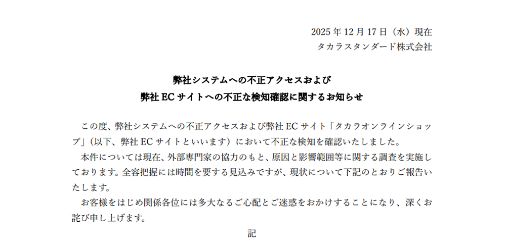 タカラスタンダード株式会社は2025年12月17日、同社システムへの不正アクセスおよび公式ECサイトでの不正な挙動を確認したと発表しました。