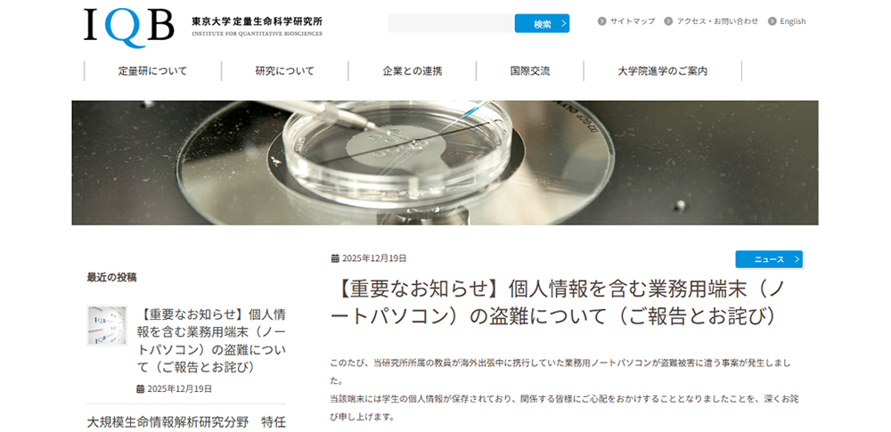 定量生命科学研究所は2025年12月19日、所属教員が海外出張中に携行していた業務用ノートパソコンが盗難被害に遭い、記録されていた1,323人分の学生情報の漏えい可能性を発表しました。