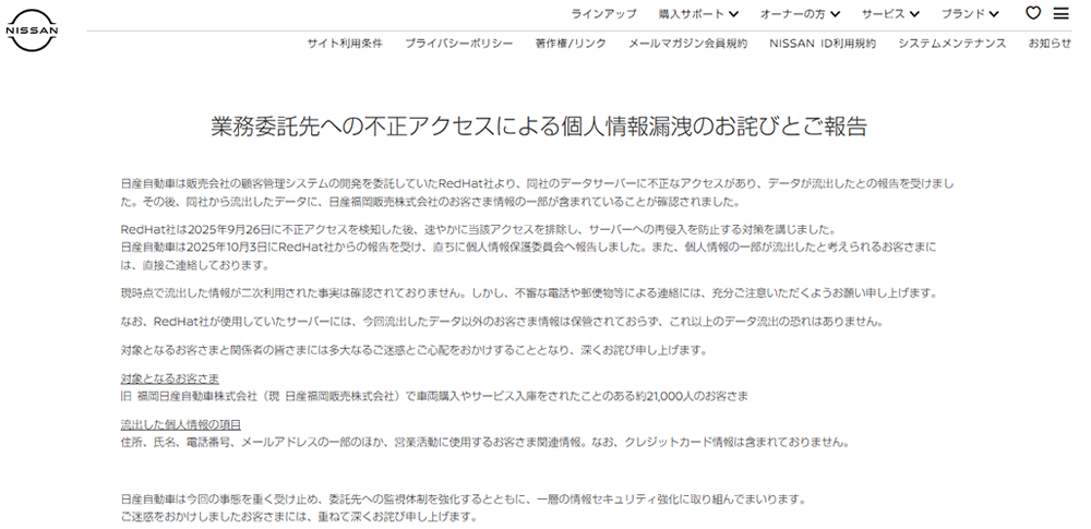 日産自動車株式会社は2025年12月23日までに、販売会社の顧客管理システム開発を委託していたRed Hat社のデータサーバーが不正アクセスを受け、日産福岡販売株式会社の顧客約2万1,000人の個人情報が外部に流出した可能性があると発表しました。