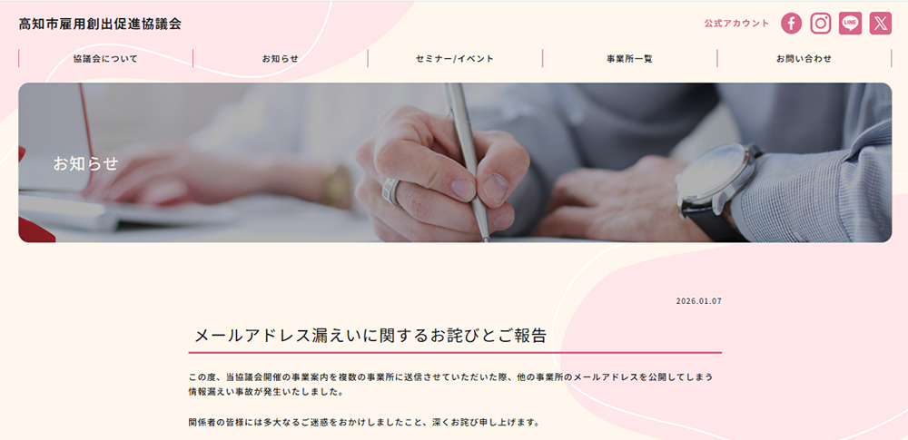 高知市雇用創出促進協議会は2026年1月7日、事業案内メールの送信時に他の事業所のメールアドレスが閲覧可能な状態となる情報漏えいが発生したとして、謝罪と再発防止策を公表しました。