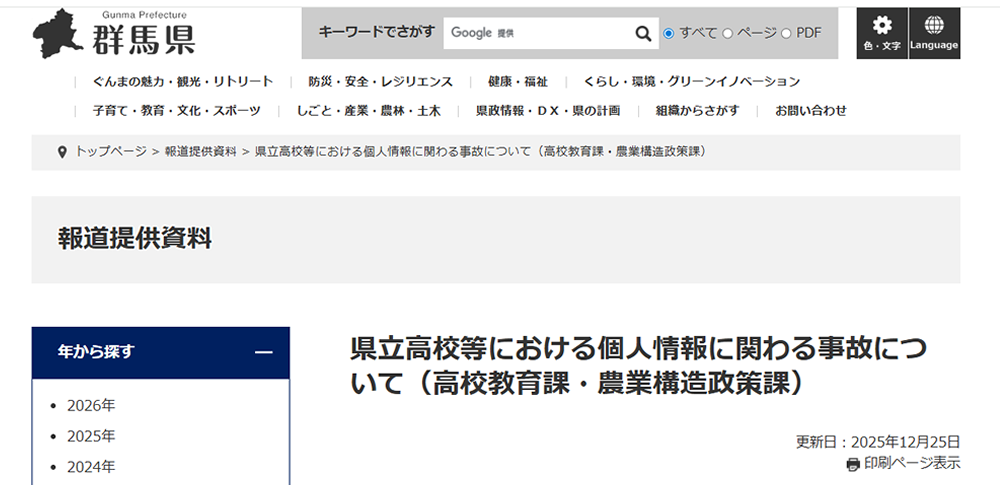 群馬県は2025年12月25日、県立高校および県立農林大学校に所属する非常勤講師の私物パソコンが「サポート詐欺」の被害に遭い、記録されていた教材や生徒・学生の個人情報が削除された可能性があると発表しました。