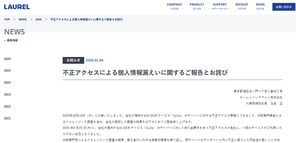 ローレルバンクマシン株式会社は2026年1月9日、同社が提供するAI-OCRサービス「Jijilla」のサーバーに対する不正アクセスに伴う外部専門業者によるフォレンジック調査を含む調査結果を公表しました。
